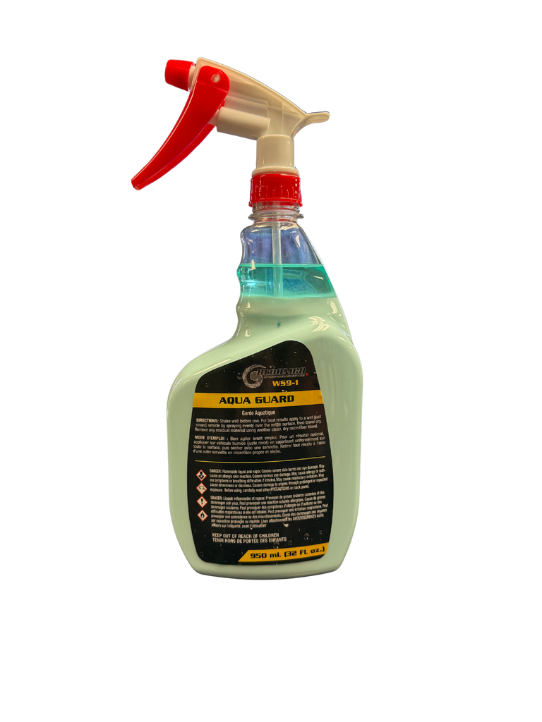 AQUA GUARD offers a long lasting protective film to most auto surfaces: paint, trim, chrome and glass. Dry and seal in one step! Introducing Bloomco's Aqua Guard, our newest innovation to cut drying time and protect vehicle all in one single step. Works on just rinsed or damp surfaces. Just spray into microfibre and buff into a high gloss finish. Won't streak, even with a terry cloth towel. Liquified paint seal formulation lasts up to 4 -6 months depending on conditions. Safe on glass surfaces and will not turn moldings white.